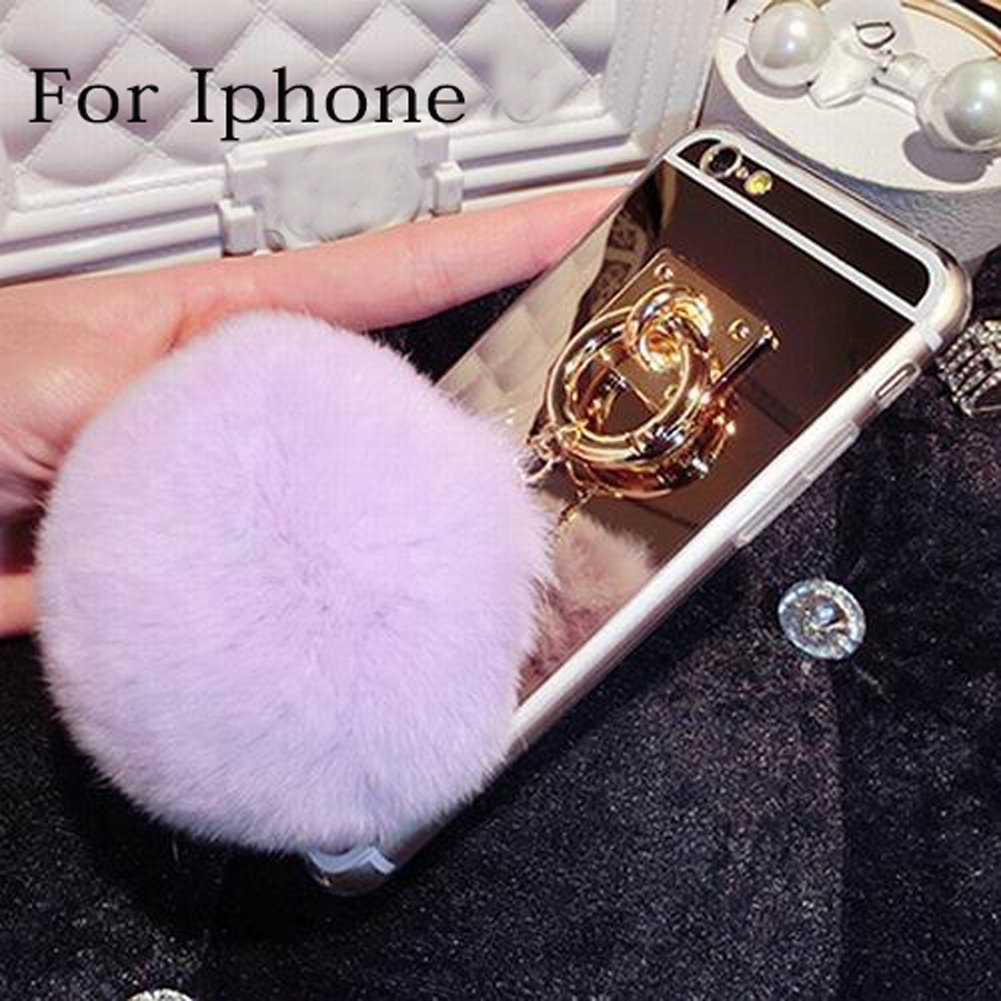 Fox Fur Pom Pom Keychain Case For Iphone5 6 6s 4 7 Plated Mirror Back Cover 0 3mm Tpu Phone Coque Case For Iphone 5 6splus Case Free Cell Phone Cases
